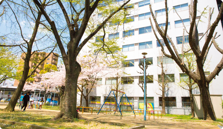 鉄道3線3駅から徒歩2〜3分という利便性の高い立地にありながら福島公園に面しており、保育室は全室南向きで明るく、四季を感じることのできる好環境です。